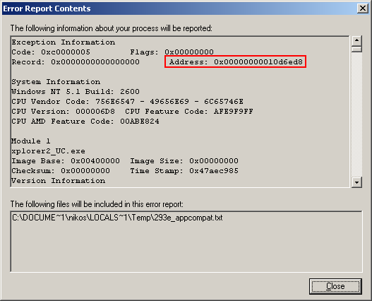 Working with windows shell is a tricky affair. Its open architecture allows all and sundry to write a shell extension, say add a command to the context (right click) menu for text files. Writing shell extensions is relatively simple for today's programming standards and as a result there are tons of them out there, and many are buggy. xplorer˛ integrates with windows shell architecture so most things that work in windows explorer are also in xplorer˛, including bug-ridden extension DLLs. The majority of crashes you may experience working with xplorer˛ are invariably caused by such poorly programmed DLLs — but xplorer˛ takes the blame! Today I want to set the record straight and explain in simple terms what happens and how can you tell that a crash is in xplorer˛ or in some external module. That should clear xplorer˛ of most charges, yer honour <g> First a crash [sic] course on address ranges. Each program takes space both on the hard disk and in computer RAM memory when running. For simplicity let's say that the operating system allocates 2GB of room for each running executable. The lower part, from byte #0 to byte #16,000,000 (the lower 16MB or 0x01000000 in hexadecimal) is taken up by the program itself (xplorer˛). Addresses above 0x01000000 are occupied by DLLs. If a program is big (many bytes) its address space will be full of machine code, otherwise it will be mostly empty space. No program is 2GB anyway — although microsoft are getting there with vista. DLLs or Dynamic Link Libraries are partial programs (like subroutines) that offer services to processes like xplorer˛. The code that draws push buttons in dialogs is an example of something furnished by a system DLL (USER32.DLL). I don't need to write code that draws buttons, I just link to USER32.DLL and have it for free — how convenient! When windows loads xplorer˛, it also loads all the necessary DLLs and places them in the high memory area above address 0x01000000. All shell extensions are DLLs, so they end up in xplorer˛ address space, and their subroutines are getting called from time to time. If the code is badly written, causing this or the other fault (eg. access violation), windows stops xplorer˛ and reports a crash. It's like you invite someone in your house and he gets drunk and burns it down. Most of the DLLs that crash xplorer˛ are written in a language called Delphi. Not that it is inherently lame, but I suspect somebody wrote a sample shell extension that was buggy, and then many people built their own using this sample as a starting point so they copy/pasted the same troublesome code. If the crash is on exit and reports Runtime Error 216 it is definitely a Delphi error. With all this information we can now decipher information in crash dialogs. The crash address, where program instruction pointer was, gives away where was the crash, whereabouts in the program address space. If the location is above 0x01000000 then it is a DLL fault, if it is below then it is a xplorer˛ fault. Can we find which DLL caused the crash? With a little detective work we can. First we need to install process explorer. This can show loads of interesting information, including how a program's address space is laid out. We just need to find which DLL occupies the faulting address, where the program execution was interrupted. If say LAME_NSE.DLL is mapped in the region 0x01000000—0x01500000 and the crash is at 0x01200000 then it is code in LAME_NSE.DLL to blame. I wrote a namespace extension DLL that is crashing on purpose to demonstrate the procedure. You can see it in action in today's debugging demo Once you find your culprit, you may want to uninstall it through control panel or use a tool like ShellExView to disable it. Or if you are a true stoic you can just ignore the crash and get on with your life <g>. Crashes on exit are not a real problem for your system or your files — and definitely not xplorer˛'s fault!