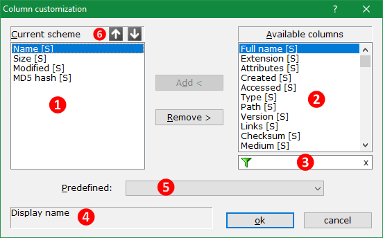 Current scheme box [1] lists the columns you have already chosen and show in the header. Click Remove button to remove the selected column from the current set. Columns available for selection box [2] lists all available properties, included e[X]tended properties provided by shell extensions. Select a property from the available box and double click on it (or click Add button) to add it in the current column set.