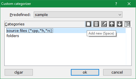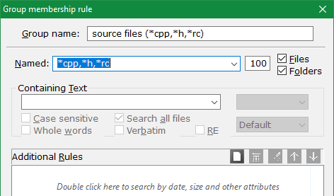 The example in figure 12 will create (up to) 3 categories in each browsed folder, one will have files with CPP, H and RC extensions (it is wildcard based), the second will gather all folders, and all the remaining files will be in unspecified category.