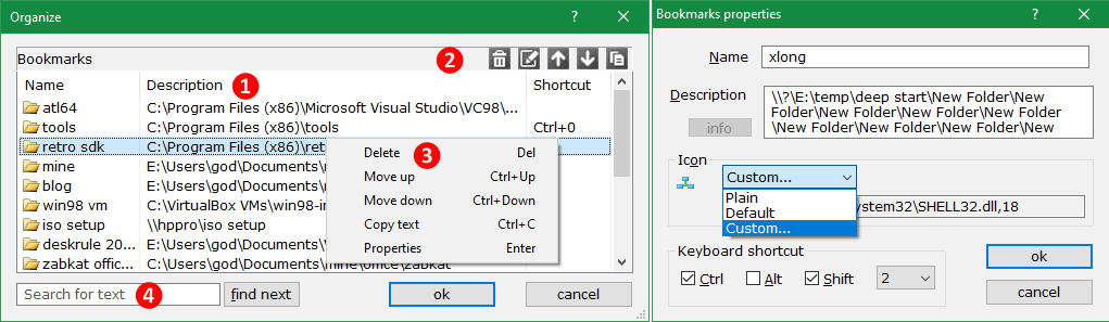 The organize list shows bookmark details [1]: the name, "description" (this is the actual folder path), and any shortcut key associated to the bookmark for easy invocation by keyboard. To operate on the list use the little toolbar [2] (use the button popup tooltips to see what each one does) or equivalently right click on an item to modify it using the context menu [3]. Use the search box [4] to find a bookmark by name. This box matches strings in both name and description columns. Click Find next to find the bookmark; if that wasn't the one you wanted, click Find next again for the next match.