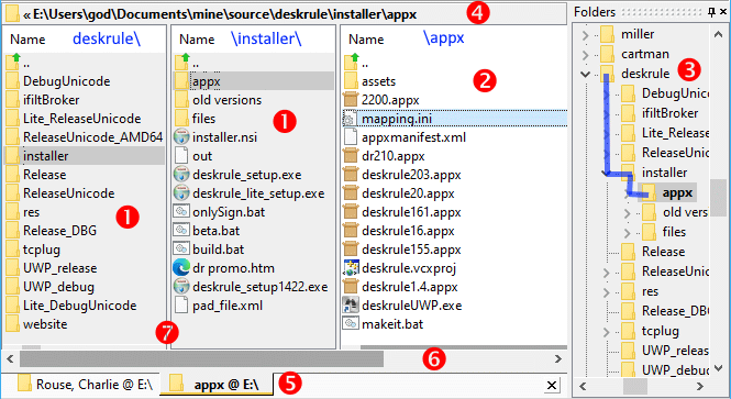 Usually when you browse into a subfolder, the current tab switches entirely to it. Say you were browsing C:\path\DESKRULE and then you entered the subfolder C:\path\DESKRULE\INSTALLER, you'd expect to see the contents of INSTALLER folder replacing the old pane contents. If you turn on Miller browsing (File > Column mode menu) then both the original and the subfolder contents will show side by side. If you enter a new sub-sub folder e.g. C:\path\DESKRULE\INSTALLER\APPX then a third side panel will open, and so on. As you browse deeper, panes to the left shrink in width. If you have too many folders simultaneously open, a scroll bar will appear to help you manage the panes, since only a few of them will show at a time.