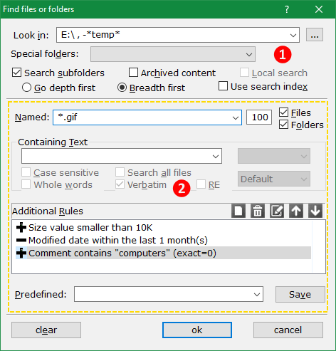 You initiate a search using Tools > Find files command. The ensuing dialog (figure 43 below) is relatively simple considering the amount of information it conveys. Broadly speaking it is divided in two sections, the search context [1] that specifies where to search, and the hyper-filter [2] that controls what to search for, the parameters of the files that will be considered positive hits.