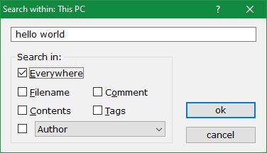 Tick Everywhere box if you want to find keywords in any searchable property. That is the simplest search mode. If you want to target something in particular like Filename or text Content use any of the other checkboxes. You can tick as many as you like. You can use custom indexed properties as well using the drop-down list (see Author in the above example).